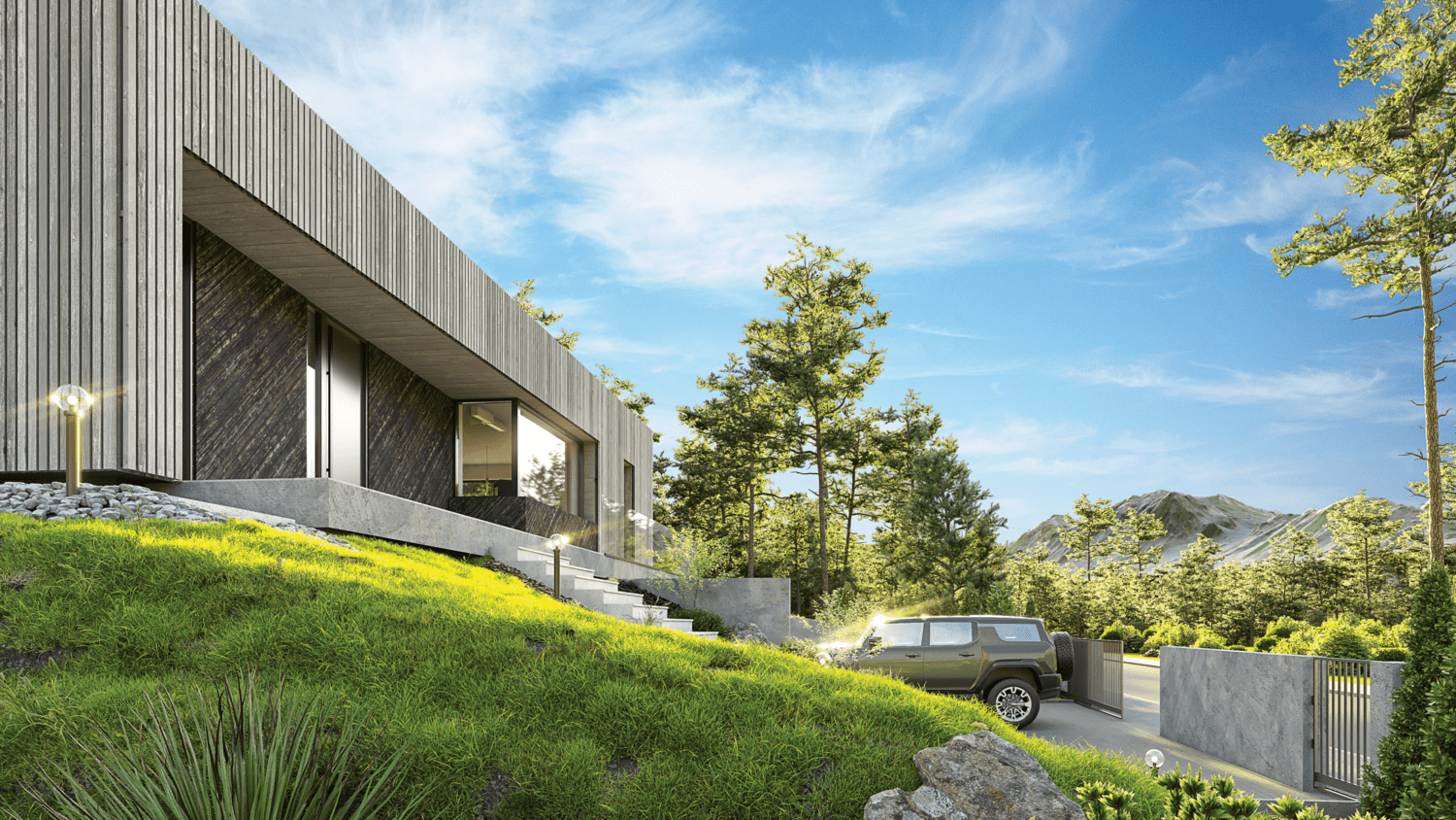 Prosta konstrukcja budynku w rzeczywistości opiera się na solidnych inżynierskich rozwiązaniach, które były niezbędne, by wpisać dom i garaż w bryłę naturalnie występującej na działce skarpy.