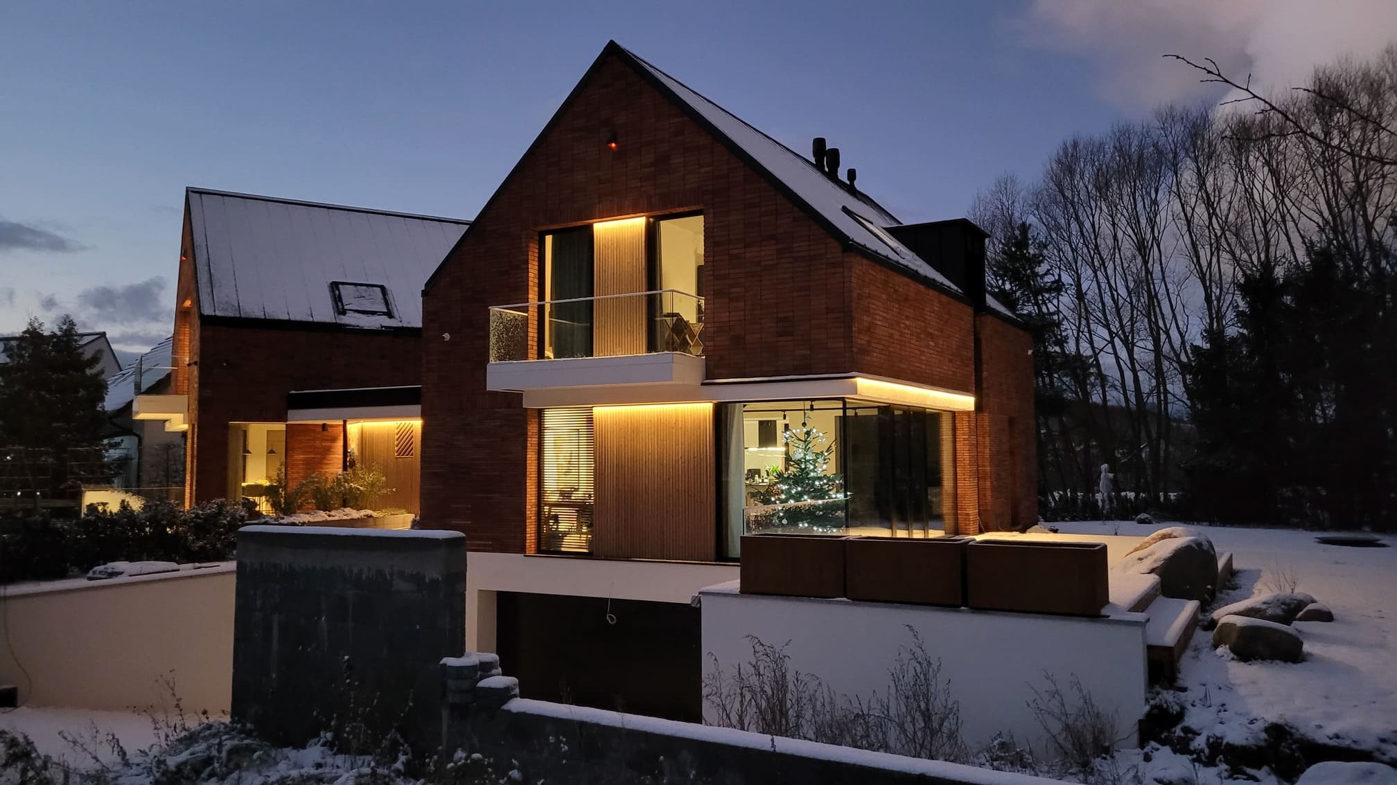 Założeniem było stworzenie domu nowoczesnego, który pozostanie w zgodzie z otoczeniem, komponując się z okolicznym lasem. Dlatego powstały dwie nowoczesne stodoły z czerwonej cegły z czarnym dachami i stolarką okienną. Duże przeszklenia otwierają widok na las oraz wpuszczają do środka maksymalną ilość promieni słonecznych.