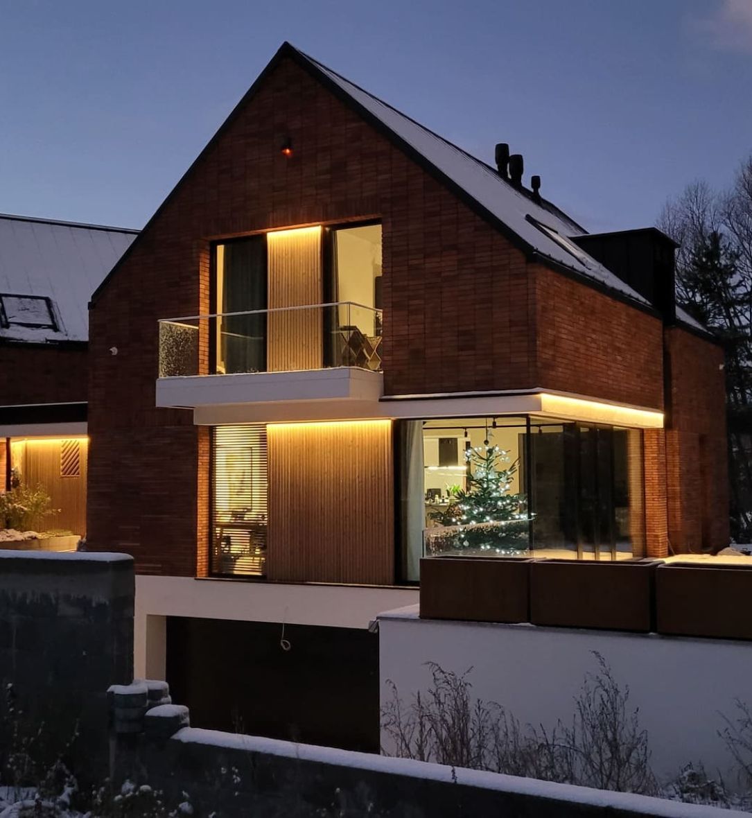 Założeniem było stworzenie domu nowoczesnego, który pozostanie w zgodzie z otoczeniem, komponując się z okolicznym lasem. Dlatego powstały dwie nowoczesne stodoły z czerwonej cegły z czarnym dachami i stolarką okienną. Duże przeszklenia otwierają widok na las oraz wpuszczają do środka maksymalną ilość promieni słonecznych.